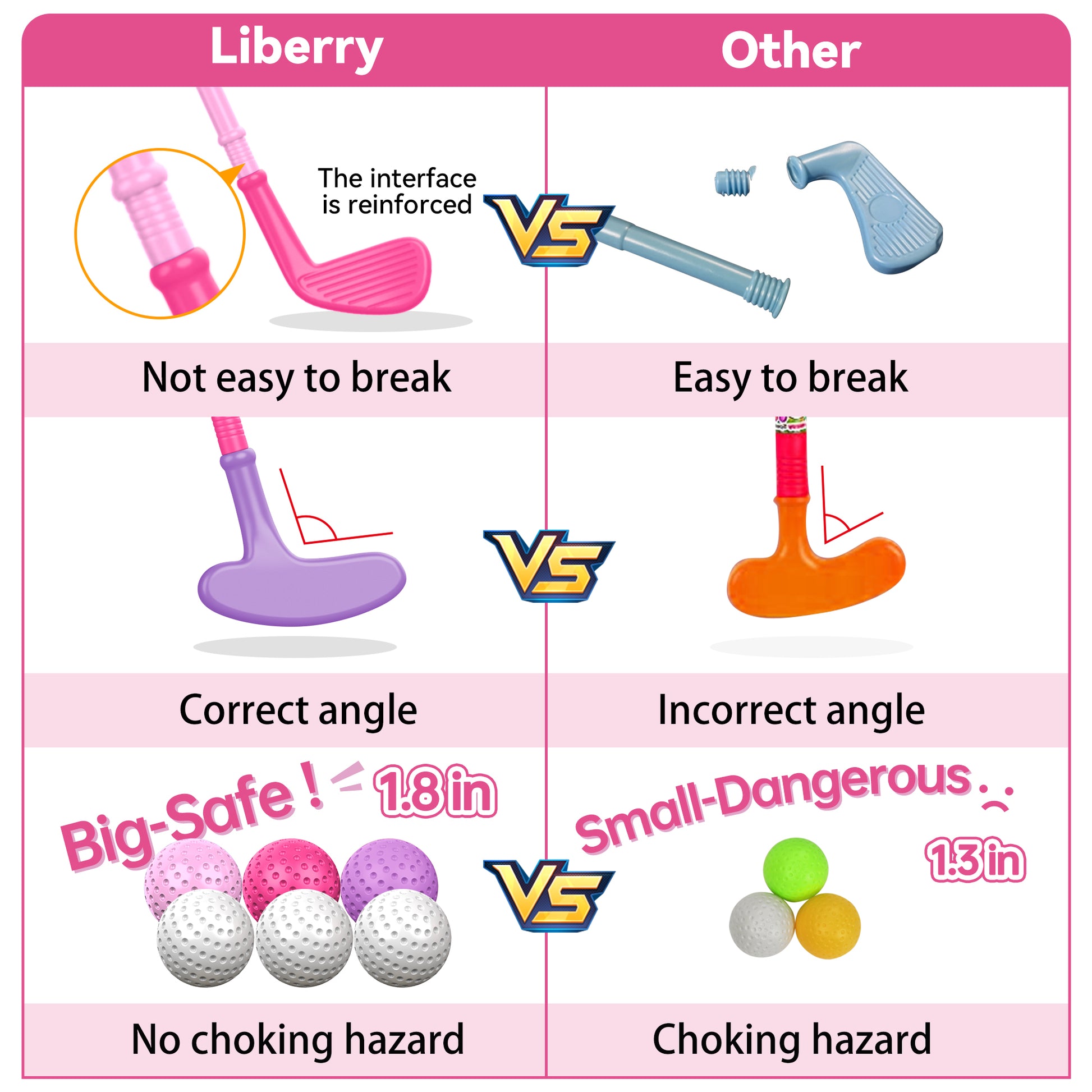 1、SAFE AND DURABLE: The latest kids golf set is made of high-quality plastic, odorless and no sharp edges or burrs. the clubs have enhanced hardness and are not easily broken. Plus, our golf balls are larger (1.8 inches) to effectively avoid choking hazards